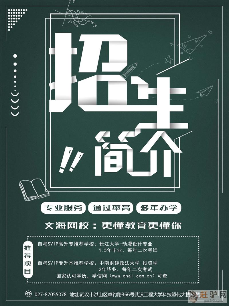 www.ganlv5.com赶驴网自考4月份注册,专科长江大学动漫设计,最快1.5年毕业;本科中南财大投资学,最快2年毕业。高端模式,高通过率。来源www.ganlv5.com